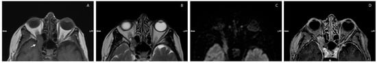 MRI sequences above show pathologic tissue (arrow) growing through the right retrobulbar fat at the apex of the orbit; this involves the inferior orbital fissure and the lateral wall of sphenoid sinus, until it contacts the ipsilateral cavernous sinus. (A) Axial T1 FSE: the lesion appears iso-intense to muscle. (B) Axial T2 weighted: the lesion shows a non-homogeneous signal intensity due to areas of cystic degeneration in the ventral part. (C) DWI: the lesion shows a restriction of the proton density. (D) Fat-saturated contrast-enhanced axial T1 weighted: the lesion shows high enhancement.