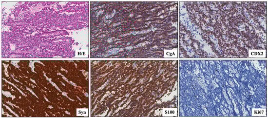 An incisional biopsy of the solid tissue in the pterygoid palatine fossa was performed. The tumor was composed of small to medium-sized cells with a hyperchromic nucleus and eosinophilic cytoplasm, with a mixed solid and trabecular growth pattern. Focal pseudo-glandular and papillary-like aspects with rosettes were present. The immunohistochemistry showed the intense and diffuse positivity of CKAE1/AE3, S100, Synaptophysin, Chromogranin A, CD56, INSM1, and CDX2, negativity for CD99, Vimentin, CD20, CD3, p40, p62 smooth muscle actin, TTF1, prolactin, ACTH, GH, FSH, LH, TSH, MELAN-A, CEA, p16, and p53, and a Ki67 proliferation index of 6% (Figure 4). Focal areas of necrosis were observed with a mitotic rate of 0 mitoses/2 mm2; no figures of lympho-vascular and perineural invasion were reported. According to the 2019 WHO Classification [,], these findings suggested a diagnosis of well-differentiated neuroendocrine tumor (WD-NET G2), not excluding the possible diagnosis of ectopic hypophyseal adenoma (S100+) or a metastatic localization of gastroenteropancreatic neuroendocrine tumors (GEP-NETs) (CDX2+) []. Indeed, transcription factors can indicate the site of a primary tumor in the setting of an unknown primary. Although not entirely specific, lung origin is favored by TTF-1, pancreatic origin by Isl1 and PAX8, and intestinal origin by CDX2 [,].
