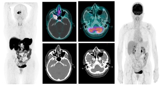 - Morland, D.; Jallet, L.; Deguelte, S.; Cadiot, G.; Papathanassiou, D. Orbital Metastasis: A Rare but Typical Location of Small Intestine Neuroendocrine Tumor on 18F-FDOPA PET/CT. Clin. Nucl. Med. 2022, 47, 717–718. [Google Scholar] [CrossRef] [PubMed]