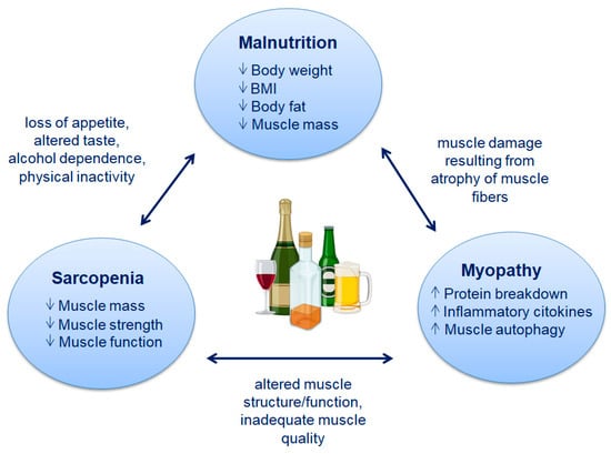 Another commonly used term is alcoholic myopathy (Figure 1), which often refers to muscle damage rather than muscle loss. Although skeletal muscle injury can occur during acute alcohol abuse, probably due to the direct effects of alcohol or its toxic metabolite, acetaldehyde, a much more frequent consequence is skeletal muscle loss due to concomitant alcohol-related liver damage [20]. Most of these studies were conducted in animal models, in which the duration of treatment and levels of alcohol consumption were defined by the researchers. From these experimental studies, it is apparent that chronic alcohol consumption leads to reduced cross-sectional area (CSA) of type 2 fibers and protein synthesis, activation of pro-inflammatory cytokines, hyperammonemia, muscle autophagy, and mitochondrial alterations [15,16,21,22,23]. On the other hand, there is a great difficulty in conducting the same studies in humans, where it often becomes complicated to identify the concentration of alcohol to be administered, as well as the duration of treatment, ultimately risking unreliable results.