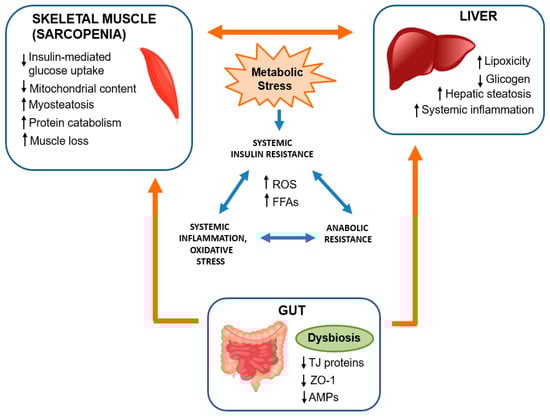 Although sarcopenia is a debilitating process most often related to aging [17], characterized by frailty, disability, and increased risk of fractures related to falls, in younger individuals, sarcopenia can result from a variety of factors, including metabolic syndrome, physical inactivity, inadequate nutrition, alterations in the gut microbiota, neuromuscular diseases, and high alcohol consumption [18]. For this reason, an important distinction is made between primary sarcopenia, or loss of muscle mass and strength that accompanies aging, and secondary sarcopenia, which occurs in disease states [19].