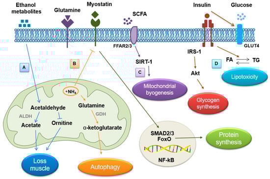 Schematic representation of the main effects of alcohol on skeletal muscle: (A) Under normal conditions in skeletal muscle cells, ethanol and its metabolites (acetaldehyde) are metabolized by ALDH to acetate, but high amounts of alcohol lead to the inhibition of ALDH, which, by altering the urea cycle, induces muscle loss. (B) Hyperammonemia activates, on the one hand, the autophagy process, stimulating the metabolism of glutamine into α-ketoglutarate, and, on the other hand, it inhibits myostatin, increasing muscle loss by reducing protein synthesis. (C) Ethanol interferes with mitochondrial biogenesis by reducing circulating SCFAs. (D) A condition of insulin resistance induced by excessive consumption of ethanol leads to alterations in lipid metabolism, characterized by an increase in circulating fatty acids and triglycerides, which induce lipotoxicity. ALDH: aldehyde dehydrogenase; SCFAs: short chain fatty acids.