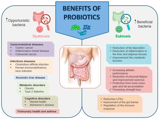The WHO has defined probiotics as “living microorganisms that if administered in adequate doses provide benefits to the health of the host” [115]. Nobel laureate Elie Metchnikoff introduced the concept of probiotics to the scientific community. He published a seminal report linking the longevity of Bulgarians with the consumption of fermented milk products containing viable Lactobacilli [136]. This observation suggested that certain microbes, when ingested, could be beneficial for human health. Since then, probiotics have been widely marketed and consumed, mostly as dietary supplements or functional foods. Probiotics modulate the gut microbiota, promoting an anti-inflammatory environment that counteracts bacterial translocation and endotoxin production, and improves the integrity of the intestinal barrier [137]. Some of the benefits of probiotics are depicted in Figure 4. Numerous articles, reviews, and systematic reviews have highlighted the impact of probiotics on host health. These sources extensively discuss the preventive role of probiotics in various health issues, encompassing conditions such as inflammatory bowel disease (IBD), antibiotic-associated diarrhea, infection-induced diarrhea, as well as allergic rhinitis and allergic disorders like atopic dermatitis (eczema) [138,139,140,141].
