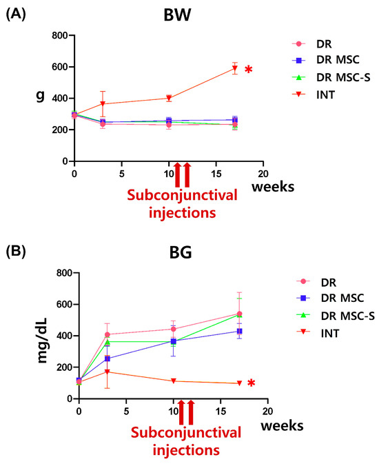 Changes in BW and BG over time. (A) A graph for BW changes over time (B) A graph for BG changes over time; subconjunctival administration was conducted at 11 and 12 weeks post-diabetes induction. There were no significant differences in BW and BG among the DR, DR-MSC, and DR-MSC-S groups at week 17. The INT group exhibited significantly higher BW and lower BG at all time points. * p < 0.01, INT, n = 8 rats; DR, n = 7 rats; DR-MSC, n = 4 rats; DR-MSC-S, n = 6 rats. Abbreviations: BW, body weight; BG, blood glucose; INT, intact control group; DR, diabetic retinopathy group; DR-MSC, DR group with subconjunctival MSC injection; DR-MSC-S, DR group with subconjunctival sirolimus-pretreated MSC injection.