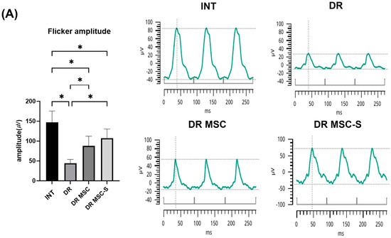 Patients with DR are known to experience significant decreases in retinal function compared to their pre-disease state [37]. According to various studies measuring ERG in diabetic rats, the DR-induced groups exhibited a significantly reduced b-wave compared to the normal control [38,39,40,41]. Furthermore, flicker ERG recorded at a frequency of 30 Hz is reduced in amplitude in patients with moderate to severe DR [42]. Consistent with these findings, this study demonstrated a substantial decrease in both b-wave and flicker ERG amplitude in the DR-induced groups compared to the INT group. Nevertheless, an improvement in both amplitudes was observed in the DR-MSC-S group compared to the DR group, suggesting that sirolimus-pretreated MSCs may improve the retinal function of DR rats.