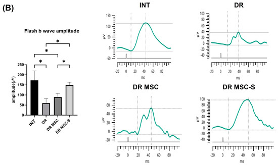 The average flash b-wave amplitudes in the INT, DR, DR-MSC, and DR-MSC-S groups were 173.30 ± 46.19 µV, 60.21 ± 22.31 µV, 89.53 ± 18.46 µV, and 148.50 ± 17.32 µV, respectively (Figure 3B). The DR-MSC-S group exhibited significantly higher values than both the DR and DR-MSC groups (p < 0.01).