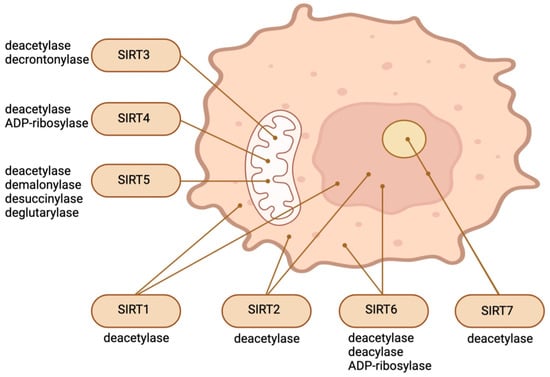 Intracellular location and main enzymatic activities of SIRTs. The figure was partly created with BioRender.com.