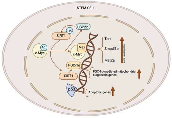 Stem cells, such as mouse ESCs and iPSCs, exhibit high expression levels of both SIRT1 and c-Myc. SIRT1 increases the stability of c-Myc in these stem cells by deacetylating it; this is likely the result of a reported exchange of K63-linked versus K48-linked polyubiquitination chains [18,28]. Enhanced c-Myc stability promotes the transcription of c-Myc target genes in stem cells, like Usp22, Mat2a, Smpdl3b, and Tert. Elevated MAT2A expression in mouse ESCs stimulates the synthesis of SAM from methionine; this, in turn, elevates the H3K4me3 content of pluripotent genes, thereby stimulating their expression [18,19]. This process is critical for the maintenance of pluripotent stem cells. Additionally, c-Myc raises the production of SMPDL3B in mouse ESCs. This changes the sphingolipids on the plasma membrane and affects signaling pathways that promote neuronal differentiation as well as the fluidity of the membrane. C-Myc increases the transcription of Tert in post-reprogrammed iPSCs in order to facilitate telomere elongation [29]. In the absence of SIRT1, iPSCs amass chromosomal aberrations and exhibit telomeric heterochromatin de-repression. Consequently, SIRT1 exerts a positive regulatory effect on TERT expression through the enhancement of c-Myc protein stability (Figure 2) [29].