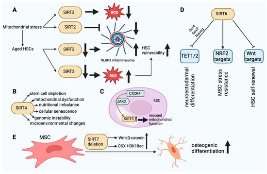 (A). The dysfunction of SIRT2 and SIRT3 in aged HSCs finally leads to HSC vulnerability. In aging HSCs, the activity of SIRT2 is decreased, resulting in an increase in NLRP3 inflammasome activity. In turn, the decrease in SIRT3 activity results in damage to HSCs due to ROS accumulation. (B). The main effects of SIRT4 in SC aging. SIRT4 dysfunction can affect the cellular functions outlined above. (C). SIRT5 upregulation mediated by CXCR4 via JAK2 can rescue normal mitochondrial function in ESCs. (D). SIRT6-mediated epigenetic regulatory functions in SCs. TET1/2 inhibition via Oct4, Sox2, and Nanog may affect neuroectodermal differentiation. Inhibition of Wnt target molecules may regulate the self-renewal capacity of HSCs. Stimulation of NRF2 target molecules may enhance the stress resistance of MSCs. (E). SIRT7 deletion enhances the osteogenic differentiation of MSCs in bone marrow by elevating H3K18ac levels at the promoter of the OSX transcription factor and activating the Wnt/β-catenin signaling pathway. This figure was partly created with BioRender.com.