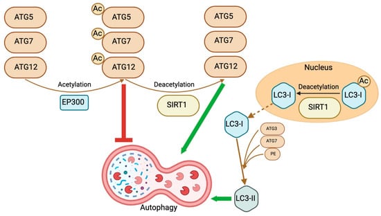 A crucial event in autophagy is the transformation of soluble LC3 into membrane-bound LC3-PE. Membrane-attached LC3-PE regulates several crucial autophagy processes, including phagophore growth and expansion, cargo recruitment, and lysosome fusion [114,115,116]. The process of LC3-PE formation is dependent on the ubiquitination-like conjugation system, in which soluble LC3 becomes bound with PE with the aid of the E3-like ATG12–ATG5–ATG16L1 complex, the E2-like enzyme ATG3, and the E1-like enzyme ATG7 [97,105,106,117,118]. SIRT1 functions as the principal deacetylase, eliminating the acetyl group from lysine residues ATG5, ATG7, and LC3 that have been acetylated (Figure 4) [87].