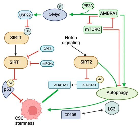 SIRT2 promotes breast cancer CSCs via Notch–autophagy connections and ALDHA1A deacetylation [197]. Renal cell CSCs also have SIRT2–CD105–LC3 molecular cross-talk, which affects their survival [203,204].