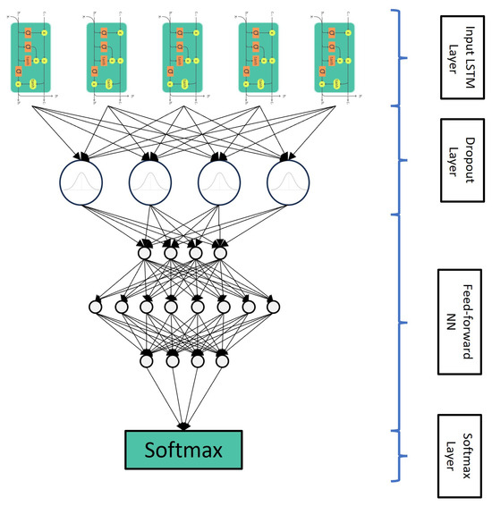 ANN Topology. The ANN has an input layer based on LSTM, a dropout layer, a feedforward neural network, and a softmax layer as the output layer.