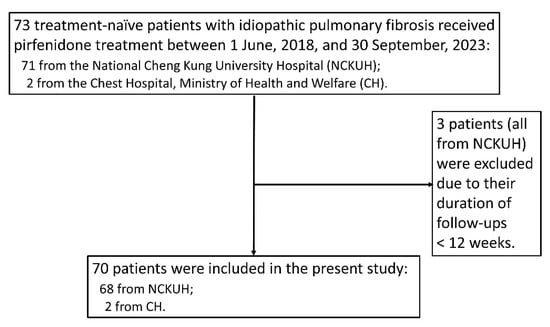 We tested our hypothesis by conducting this retrospective study involving patients with IPF who had been newly treated with pirfenidone and received regular follow-ups at NCKUH and at Chest Hospital (CH, a district hospital in southern Taiwan under the jurisdiction of the Ministry of Health and Welfare) between 1 June 2018, and 30 September 2023. The study was approved by the institutional review board of NCKUH (A-ER-107-193, A-ER-109-321, and A-ER-111-595). To be included in this study, patients had to be naïve to any antifibrotic therapy, be aged at least 50 years, have been diagnosed with IPF based on multi-disciplinary evaluations and international guidelines [,], and have received uninterrupted pirfenidone treatment for at least 12 weeks. We followed all included patients until death or 30 September 2023. Drug compliance was assessed during each outpatient visit and hospitalization. The electronic medical records for every patient were carefully reviewed and the following data were systematically retrieved: demographics; comorbidities (for the calculation of the Charlson comorbidity index [CCI]); smoking status; echocardiographic evidence of pulmonary hypertension; serial measurements of forced vital capacity (FVC) and diffusion capacity for carbon monoxide (DLCO) before and after pirfenidone treatment; gender-age-physiology (GAP) stages; pirfenidone dosing; and incidence and dates of AE-IPF, lung transplantation, and mortality.