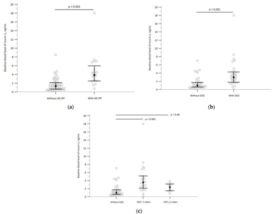 Baseline plasma mucin-1 levels of: (a) patients with AE-IPF versus those without AE-IPF; (b) patients with SAO versus those without SAO; and (c) patients without SAO versus those with SAO in <2 years or ≥2 years of pirfenidone treatment. The solid black dots and horizontal bars indicate medians and interquartile ranges, respectively. The Mann–Whitney U test was used for inter-group comparisons. Abbreviations: AE-IPF, acute exacerbation of idiopathic pulmonary fibrosis; SAO, severe adverse outcomes (including on-treatment lung transplantation and all-cause mortality).
