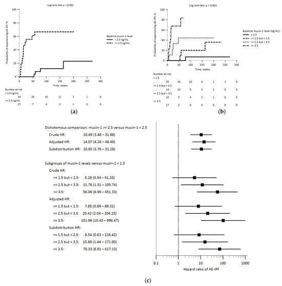 Legends: Kaplan–Meier analysis revealed a significant longitudinal difference in the probability of developing on-treatment AE-IPF: (a) between patient groups based on baseline plasma mucin-1 levels (≥2.5 versus <2.5, ng/mL); (b) among patient groups with successively increasing baseline levels of mucin-1; and (c) Cox proportional-hazard regression and subdistribution hazard regression analyses on the risk of on-treatment AE-IPF. Abbreviations: AE-IPF, acute exacerbation of idiopathic pulmonary fibrosis; HR, hazard ratio.