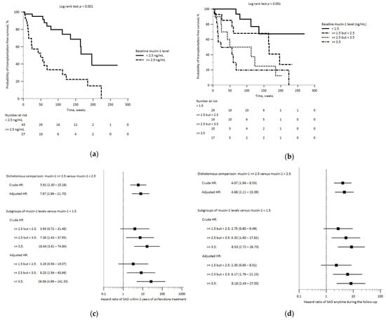 Legends: Kaplan–Meier analysis revealed a significant longitudinal difference in the probability of transplantation-free survival: (a) between patient groups based on baseline plasma mucin-1 levels (≥2.5 versus <2.5, ng/mL); and (b) among patient groups with successively increasing baseline levels of mucin-1. Cox proportional-hazard regression analyses on the risk of on-treatment: (c) early SAO (within 2 years after pirfenidone treatment had begun); and (d) SAO anytime throughout the follow-up period. Abbreviations: HR, hazard ratio; SAO, severe adverse outcomes (including on-treatment lung transplantation and all-cause mortality).