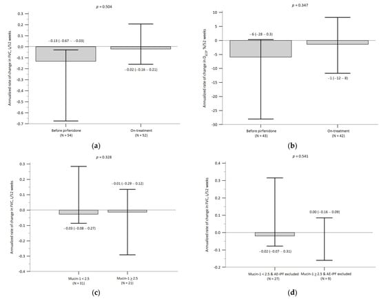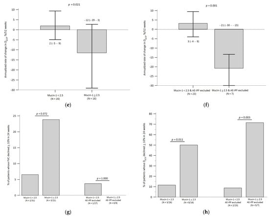 Following the initiation of pirfenidone treatment, there was an overall pattern of reduction in the annualized decline in both FVC and DLCO in the study cohort, although these differences did not reach statistical significance (Figure 5a,b). A comparison of the on-treatment annualized rates of change between the “mucin-1 ≥ 2.5” group and the “mucin-1 < 2.5” group revealed that, while there was no significant between-group difference in the annualized rate of change in FVC (either including or excluding patients with AE-IPF), the annualized rate of decline in DLCO for the “mucin-1 ≥ 2.5” group was significantly greater than that of the “mucin-1 < 2.5” group, even after excluding patients with AE-IPF (Figure 5c–f). Furthermore, a numerically greater proportion of patients in the “mucin-1 ≥ 2.5” group exhibited a ≥ 10% decline in FVC over 24 weeks than in the “mucin-1 < 2.5” group. This trend, though, may be attributable to the functionally detrimental effect of on-treatment AE-IPF (Figure 5g). However, a significantly greater proportion of patients in the “mucin-1 ≥ 2.5” group suffered a 24-week decline of ≥ 10% in DLCO than in the “mucin-1 < 2.5” group, and this finding persisted after patients with on-treatment AE-IPF had been excluded (Figure 5h).