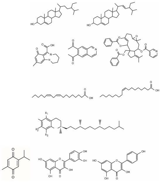 The phytochemical composition of Nigella sativa is different according to its growing region, maturity stage, processing method, and the extraction technique utilized to obtain the oil. The bioactive phytochemicals of black cumin, mostly derived from the seeds (85%), bark (8%), and sprout (7%), comprise primary and secondary metabolites belonging to different chemical classes including terpenes and terpenoids, phytosterols, alkaloids, tocols, polyphenols, and miscellaneous components. There is also a non-volatile component, represented by flavonoids, phenolic acids, tannins, and fatty acids, and a volatile one, represented by terpenic compounds [2]. In particular, the chemical constituents of Nigella sativa L. are terpenes and terpenoids (such as thymoquinone and its derivates); fatty acids (the most abundant fatty acids are linoleic acid, oleic acid, and palmitic acid); phytosterols (β-sitosterol and stigmasterol); alkaloids (such as nigellamines); polyphenols (such as quercitrin and kaempferol); carbohydrates; glycerolipids; phospholipids; vitamins; minerals; and alkane hydrocarbons (Figure 1).