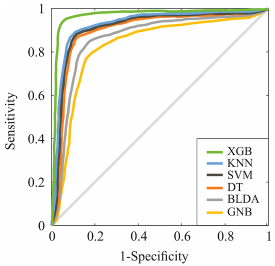 As evidenced by the data, the method proposed, XGB, is confirmed as the one with the highest acquisition and recall value. The XGB algorithm also performs consistently and uniformly with a positive prediction value greater than 95%. Additionally, the ROC curve was calculated by portraying, for each threshold value, the sensitivity and specificity measures in order to compare the classification capacity of the different ML algorithms. Figure 2 shows the results obtained. Again, the proposed XGB-based system obtains a larger area, meaning that it allows for better accuracy in prediction.