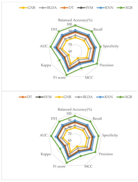 In the present study, the model-training subsets present high scores for all the training subsets’ metrics, and, generally, they show slightly lower scores for the test subset. These similarities are due to the algorithm achieving an optimal level of training without over-fitting or under-fitting. As shown in the radar plots in Figure 3, the XGB model obtains a larger area than the other methods tested, and it is a suitable example of a well-balanced model with a high capability of generation, meaning that the algorithm gives a correct exit for each new entry.