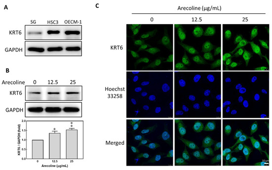 Arecoline treatment induced the expression of KRT6 in S-G cells. (A) The protein expression levels of KRT6 in S-G, HSC3, and OECM-1 cells. GAPDH was used as the loading control. (B) Expression of KRT6 proteins in S-G cells after treatment with 0, 12.5, and 25 μg/mL of arecoline for 24 h. Above, Western blotting; below, quantitative results. (C) Fluorescent images of S-G cells treated with 0, 12.5, and 25 μg/mL of arecoline were analyzed by a confocal microscope. Green represents KRT6; blue represents Hoechst 33258. Lower right corner, scale bar, 10 µm. Columns, mean of more than triplicate analysis; bars, SE. * p < 0.05 and ** p < 0.01 denote the significance levels of arecoline treatment groups compared to the control group.
