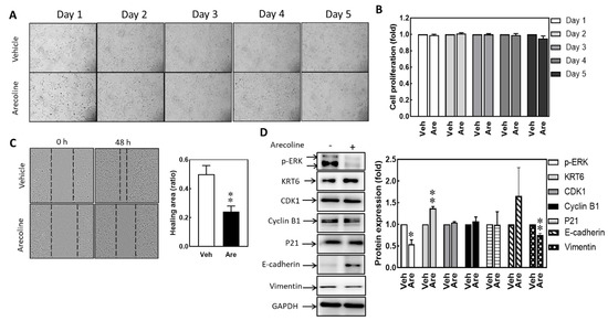 Arecoline treatment compromised the abilities of migration and cell proliferation in S-G cells. S-G cells were treated with vehicle and 12.5 μg/mL of arecoline for 1 to 5 days. (A) Cell morphology. (B) Cell viability. (C) Wound healing assay; S-G cells were treated with vehicle and 12.5 μg/mL of arecoline for 48 h. At 0 h, the tip scraped an area without cells; at 48 h, the cell-free area showed recovery. Left: magnification is 200× and the dashed line indicates the border of the cell-free area. Right: the quantified results of wound healing. (D) The protein expression levels of phospho-ERK, KRT6, CDK1, cyclin B1, and P21 in S-G cells treated with vehicle or 12.5 μg/mL of arecoline for 24 h were analyzed using Western blot analysis. GAPDH was used as the loading control. Left, Western blot; right, quantitative results. Columns, mean of more than triplicate analysis; bars, SE. * p < 0.05 and ** p < 0.01 are the significance levels of arecoline treatment groups compared to the vehicle control group.