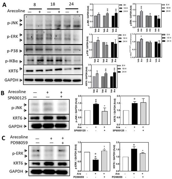 Arecoline treatment up-regulated KRT6 protein expression via ERK–NFκB signaling pathway. (A) S-G cells were treated with arecoline (12.5 μg/mL) for 8, 18, and 24 h. The protein expression levels of p-JNK, p-ERK, p-38, p-IKBαser32/36, and KRT6 were determined by Western blot analysis. Left: Western blot; right: quantitative results. S-G cells were pretreated with or without a JNK inhibitor (SP600125, 10 μM) (B) or an MEK inhibitor (PD98059, 10 μM) (C) for 2 h before incubating with 12.5 μg/mL of arecoline for 24 h. Protein expression levels of p-JNK, p-ERK, and KRT6 were analyzed using Western blot analysis. GAPDH was used as the loading control. Right, Western blot; left, quantitative results. Columns, mean of more than triplicate analysis; bars, SE. * p < 0.05 and ** p < 0.01 indicate the significance levels of arecoline treatment groups compared to the control group. + p < 0.05 and ++ p < 0.01 indicate the significance levels compared within the arecoline-treated groups.