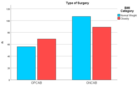 Surgical Methods by BMI Category. Distribution of OPCAB and ONCAB Surgical Procedures Among Patients Classified by BMI Category, showing comparative frequencies between normal weight and obesity groups.