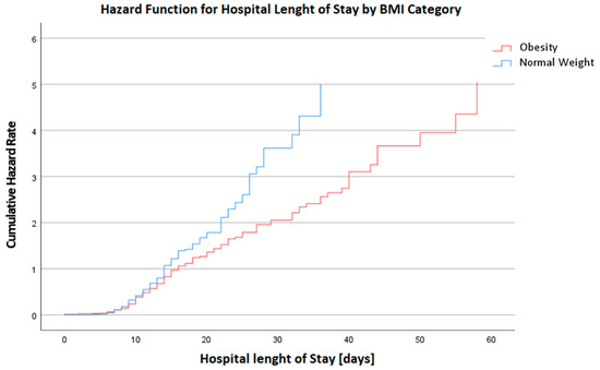 Hazard Function for Hospital Length of Stay in days by BMI Category. This graph depicts the cumulative hazard rates for the duration of hospital stay, categorized by BMI. A higher hazard rate is observed in the BMI Category 4 group, indicating an increased risk for prolonged hospital stays or complications among these patients.