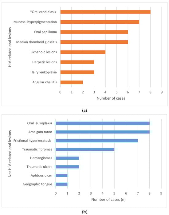 Fifty-six (n = 56) patients out of 177 (31.6%) showed oral mucosa lesions; in 21 cases, the patient had more than one lesion. Of these 56 patients, thirty (53.6%) showed HIV-related oral mucosa lesions (Figure 1a), while the remaining twenty-six (46.4%) showed oral lesions not directly associated with HIV (Figure 1b). The overall prevalence of HIV-related oral mucosa lesions in this cohort of HIV+ patients was 16.9% (30/177). Among HIV-associated oral lesions, the most prevalent ones were oral candidiasis (n = 8), oral hyperpigmentation (n = 7), rhomboid median glossitis (n = 6) and oral papilloma (n = 6).