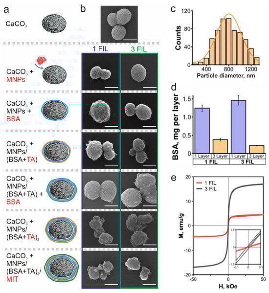 (a) Scheme of the step–by–step preparation of loaded magnetic carriers with protein–tannin–Mit shells; (b) SEM images demonstrating the change in morphology of the particles through the stepwise preparation of magnetic carriers with protein–tannin–Mit shells (scale bar—1 µm); (c) size distribution of initial CaCO3 particles; (d) dependence of BSA content in the carrier shell ofon the number of adsorption steps; (e) magnetization curves of CaCO3/MNPs particles with different MNP content at 300K.
