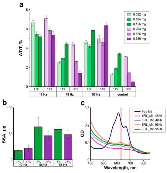 (a) Dependence of the relative temperature changes in samples in the ELF AMF treatment with 17, 48, and 95 Hz, and the MNPs content in the carriers (in mg) per well (temperature measurements were performed in a 96-well cell); (b) BSA release from protein–tannin magnetic mineral carriers after ELF AMF treatment with 0.156 mg and 0.789 mg magnetite content; (c) absorbance spectra of free mitoxantrone (0.012 mg in 0.1 M PBS) and Mit content supernatants from Mit-loaded protein–tannin magnetic mineral carriers with 0.156 mg and 0.789 mg magnetite content after ELF AMF treatment.