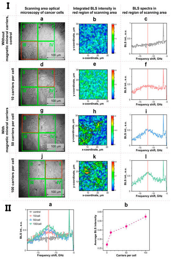 BLS 1. (I)—optical bright-field images of cancer 4T1 cells without (a) and with (d,g,j) different amounts of CaCO3/MNPs3/(BSA/TA)2protein—tannin magnetic mineral carriers; BLS maps (b,e,h,k) in the “red region” of the scanning area; pseudo color scale corresponds to BLS intensity on the z-coordinate in the “red region” (pseudo color-coded integrated BLS intensity is used); BLS spectra (c,f,i,l) in the I + II + III + IV regions of the scanning area. (II)—BLS spectra (a) obtained from all regions of the scanning area; average integrated BLS intensity dependence (b) of the added carriers per cell.