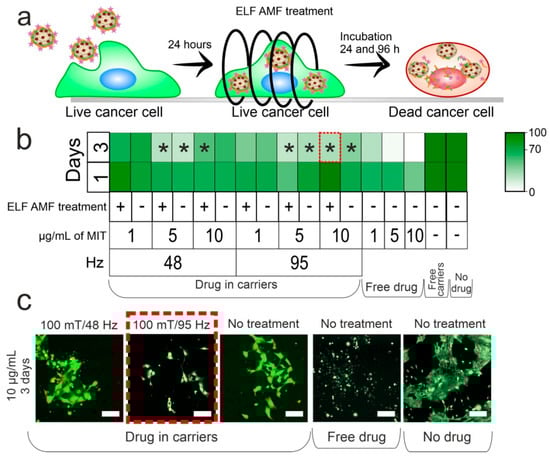 (a) Schematic representation of AF AMF treatment on the submicron carriers in the cells; (b) cell viability of 4T1 cancer cells under 48 and 95 Hz treatment by ELF AMFs (100 mT) at different concentrations of MIT (1, 5, 10 mg/mL) in the CaCO3/MNP3/(BSA/TA)2Mit carriers. An asterisk (*) indicates significant differences from the control cell group. The statistical analysis was performed by ANOVA followed by the Turkey test (p < 0.05). (c) CLSM—images of 4T1 cancer cells cultivated with carriers (10 μg/mL) during 3 days with loaded and free cytostatics after ELF AMF treatment. The scale bar is 30 μm. The red dashed line highlights images of cells that have the lowest cell viability.