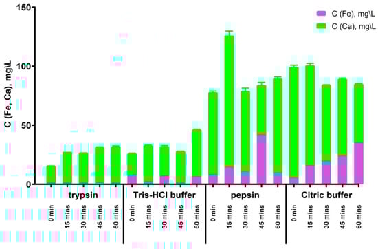 The evaluation of the release of calcium and iron ions from magnetic carriers with protein–tannin rims into model solutions is an important parameter for determining the biological safety of the proposed carriers. As previously shown [48], calcium carbonate-based magnetic nanocarriers change their crystalline form from vaterite to calcite in pepsin and citrate buffer solutions within the first 30 min. This corresponds to the maximum possible release of calcium ions, as confirmed by the AAS data (Figure 5). Fifteen minutes after placing the carriers in the pepsin solution, the maximum amount of calcium ions in the supernatant is observed for all observed samples, while a higher amount of calcium ions is observed for particles in the pepsin and citrate buffer solutions for all times of observation compared with the release of calcium ions in the trypsin and Tris-HCl buffer solutions. This is due to the fact that in acidic media more intense dissolution of calcium carbonate particles occurs than in neutral and alkaline media. The maximum amount of iron ions is observed in the supernatants of particles that were in the pepsin solution for 45 min, and in citrate buffer, there is an almost linear increase in the concentration of iron ions in the supernatants, indicating the release of iron nanoparticles from the carriers over time.