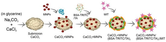 Mit-loaded magnetic carriers were prepared according to the modified procedure described in reference [30]. The stepwise preparation is presented in Scheme 1. In brief, magnetite Fe3O4 nanoparticles (MNPs) were prepared according to Massart’s ferrous–ferric salts co-precipitation method [44] with a homemade automated reactor setup [45]. The resulting MNP colloid had a concentration of 2.4 ± 0.1 mg/mL and an average particle size of 11 ± 3 nm. CaCO3 particles with the vaterite structure were synthesized according to [46].