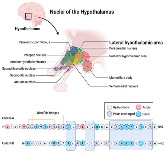 Orexin/hypocretin neuropeptides are pivotal players in regulating various physiological processes, such as food intake, metabolism, the HPA axis, reproduction, and behavior [10,21,23,43,82,83,85,109,136,265,266]. They were primarily described to orchestrate such parameters of homeostatic balance as feeding, thermogenesis, and heat dissipation [12,23,43,85,97]. Later research shed light on their intricate involvement in the mediation and modulation of such behavioral paradigms as arousal, anxiety, fear, and the stress response [11,44,65,82,106,111,116,160]. The orexin system is also implicated in the regulation of pain sensation and the behavioral changes evoked by natural and pharmacological rewards such as addiction [79,106,117,120,181,198,224,267,268]. This way, dysfunctions in the orexin system have been associated with various human pathophysiological conditions, such as obesity, addictive disorders, narcolepsy, obstructive sleep apnea–hypopnea syndrome, anxiety, cognitive disorders, and abnormal mood fluctuations [10,109,122,215,227,230,269]. This review tries to seamlessly integrate the diverse activities of orexins and provides a more in-depth understanding of those fields such as stress response, fear, anxiety, and learning in which the authors have significantly contributed to the literature [11,12,13,107,112,161].