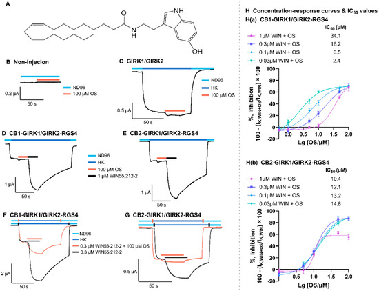 The effect of OS on non-injected oocytes, GIRK1/GIRK2 channels, and CB receptors. (A) The structure of OS. (B–F) Representative electrophysiological current traces showing the effect of OS on ion currents in non-injected oocytes and oocytes expressing receptors and/or ion channels. (B) In total, 100 μM OS in the presence of ND96 was applied to non-injected oocytes and did not change the current response through the oocytes. (C) In total, 100 μM OS in the presence of HK was applied to GIRK1/GIRK2 channels expressed in oocytes following IK,basal and did not remarkably change the response of IK,basal. (D,E) In total, 100 μM OS was applied to CB1-GIRK1/GIRK2-RGS4 and CB2-GIRK1/GIRK2-RGS4 coupling systems expressed in oocytes for 20–30 s following IK,basal and did not change the response of IK,basal. This OS application was followed by 1 μM WIN55,212-2 that induces CB-dependent inward K+ currents upon IK,basal (IK,WIN). (F,G) In total, 0.3 μM WIN55,212-2 + 100 μM OS (orange trace) and 0.3 μM WIN55,212-2 alone (black trace) were applied to CB1-GIRK1/GIRK2-RGS4 and CB2-GIRK1/GIRK2-RGS4 coupling systems expressed in oocytes for 20–30 s following IK,basal. The response of IK,WIN+OS is notably smaller than IK,WIN. All panels are representative of at least three independent experiments (n ≥ 3). (H(a),H(b)) The OS concentration–current response curves of blocking CB1 and CB2 receptors, respectively, activated by different concentrations of WIN55,212-2. All experiment data points are representative of at least three independent experiments (n ≥ 3) and data are plotted as mean ± SD.