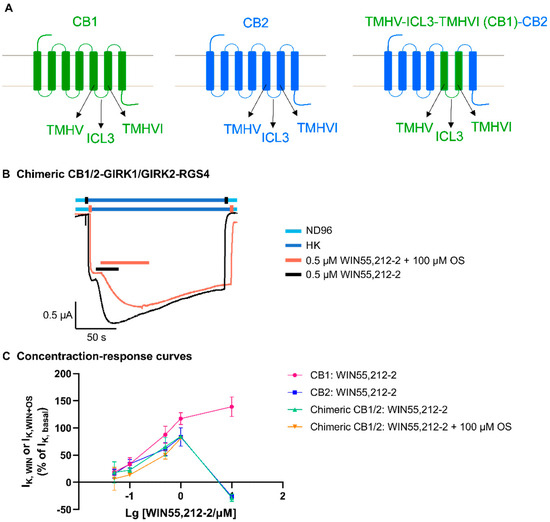 Furthermore, the dual modulation of chimeric CB1/2 and GIRK1/GIRK2 channels by WIN55,212-2 is shown in Figure 2C. The WIN55,212-2 concentration–current response curves for activating and blocking CB2 (in blue) and chimeric CB1/2 receptors (in green) are highly overlapping (Figure 2C), indicating that the dual modulatory effect on the chimera and GIRK1/GIRK2 channels by WIN55,212-2 is highly similar to that observed on CB2 receptors and GIRK1/GIRK2 channels, as described before [33].