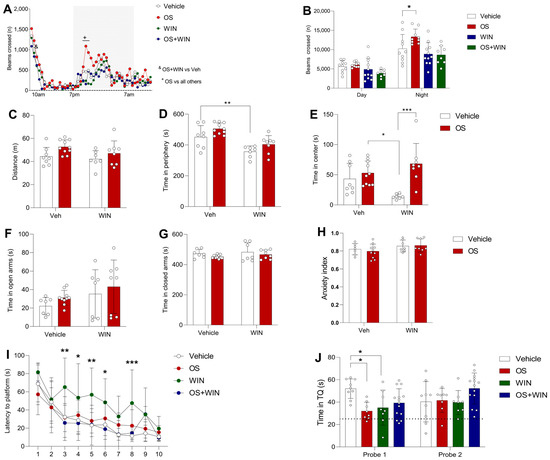 Behavior impact of OS (2 mg/kg), WIN (0.5 mg/kg), or OS + WIN i.p injections 10 min before each test. (A,B): Cage activity of C57BL/6J adult mice. (A) The activity profile revealed changes in beam crossings by mice during the 24 h (Day phase: 7 a.m.–7 p.m., Night phase: 7 p.m.–7 a.m.). (B) Assessment of the total amount of beam crossings by mice during the 24 h home cage activity test, divided into day and night phases (n = 8–11 mice per group). Data are presented as means ± SD. &: OS + WIN vs. Vehicle, * p < 0.05. +: OS vs. all other groups, ** p < 0.01. (C–E): OF test activity of C57BL/6J adult mice. (C) Total distance walked by mice in an open field. (D) Total time mice spent in the center of an open field. (E) Total time mice spent in the periphery of an open field (n = 8–11 mice per group). Data are presented as means ± SD. ** p < 0.01, the difference between the time of WIN group spent and the control spent in the periphery. (F,G): EPM test activity of C57BL/6J adult mice after i.p injections. Total time adult C57BL/6J mice spent in open (F,G) and closed arms in the EPM. There was no significant difference observed between the groups (n = 7–11 mice per group). Data are presented as means ± SD. (H) Anxiety index of mice during the EPM test. (I,J): Spatial learning and memory retention activity of C57BL/6J adult mice in the MWM test. (I) Total time mice spent to find the platform across ten training days in the MWM. Significant difference was observed on days 3, 4, 5, 6, and 8 between WIN group and the control, * p < 0.05, ** p < 0.01, and *** p < 0.001. (J) Total time mice spent in the TQ during probe trials. There is a significant difference between the control and the OS and WIN groups in the probe 1 trial (n = 8–15 mice per group). Data are presented as means ± SD, * p < 0.05 compared with the vehicle group.