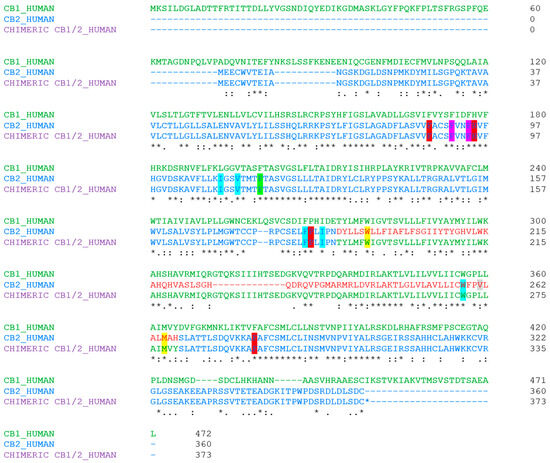 Amino acid sequence alignment of CB1 (in green) and CB2 (in blue) receptors and the chimeric CB1/2 (in blue + green) generated by a standard protein Multiple Sequence Alignment (Clustal Omega). The * indicates identical residues. The TMHV-ICL3-TMHVI domain in the CB2 receptor is in red and the TMHV-ICL3-TMHVI domain in the chimeric CB1/2 is in green. F91 and F94 in both the CB2 and the chimera are highlighted in fuchsia; F87, H95, and P184 in both the CB2 and the chimera, as well as F281 in the CB2 and its corresponding F294 in the chimera are highlighted in red; F117 in both the CB2 and the chimera, as well as W258 in the CB2 and its corresponding W271 in the chimera are highlighted in green; I110, V113, and F183 in both the CB2 and the chimera, and M265 in the CB2 and its corresponding M278 in the chimera are highlighted in yellow; I186 and W194 in both the CB2 and the chimera are highlighted in blue; V261 in the CB2 is highlighted in gray.