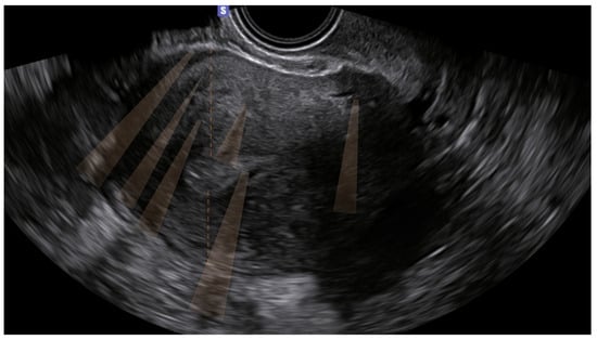 21]. These involved the recognition of a series of ultrasound characteristics which, however, were not divided into direct and indirect and were not configured in a precise diagnosis scheme. The ultrasound features considered to be typical of adenomyosis were as follows: the presence of myometrial cysts, hyperechogenic islands, echogenic sub-endometrial lines and buds, asymmetrical thickening, fan-shaped shadowing, translesional vascularity, irregular junctional zone, and interrupted junctional zone. All included patients had at least one of these signs, not considering the distinction between direct/indirect ones. The diagnosis was made with a Samsung WS80A (Suwon-si, Republic of Korea) ultrasound machine by the same operator, who is an expert in the ultrasound diagnosis of adenomyosis and endometriosis (A.B. MD). Ultrasound examination was conducted with both two-dimensional and three-dimensional techniques for the systematic evaluation of the pelvis, uterus, and ovaries, the diagnosis of adenomyosis, and the exclusion of other pathologies.