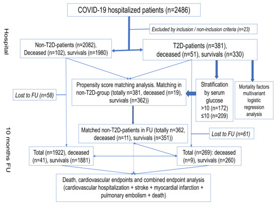 The goal of the study was to assess the outcomes of hospitalized patients with COVID-19 with or without T2D in hospital and at 10-month follow-up (FU).