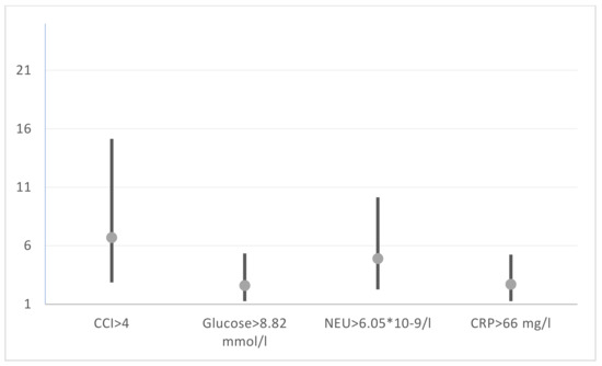Multivariate logistic regression analysis with binarized risk factors. The Charlson Comorbidity Index > 4, CRP > 66 mg/L, glucose >8.82 mmol/L, and neutrophils > 6.05 × 109/L (R2MF = 0.2457, LR = 59.48, p < 0.001) enabled a calculation of the odds ratios (ORs) and the corresponding confidence interval (CI) with a reliability of 95% for each predictor of the risk of hospital death (Table 3, Figure 2).