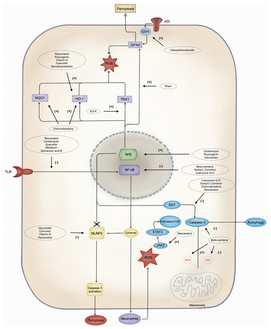 Vitamins represent another interesting group due to their antioxidant properties and potential neuroprotective effects. For instance, studies have indicated that high-dose supplementation of 1,25-vitamin D3 can mitigate cerebral damage following a stroke [40]. Although the precise regulatory mechanism by which vitamin D confers protection against cerebral IRI remains elusive, it is suggested that vitamin D may activate the Nrf2/HO-1 antioxidant pathway while suppressing the NLRP3-mediated pyroptotic pathway [40].