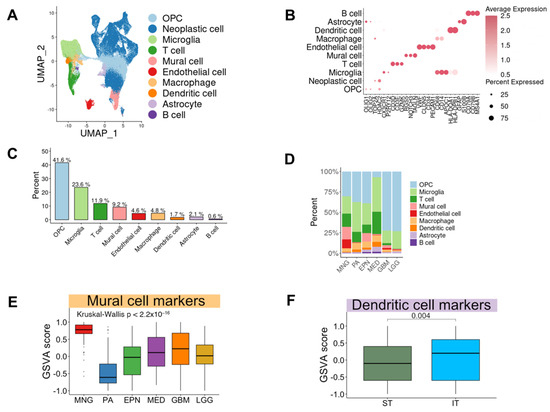 Single-cell transcriptome profiling of brain tumors: (A) UMAP plot of 124,967 brain tumor cells. Colors indicate cell types. (B) Expression of representative marker genes according to cell types. The average expression is represented by the color intensity, and the percentage of expression is shown by varying dot sizes. (C) Percentages of cell types in brain tumors. Colors are allocated by cell types. (D) Bar graph showing the proportion of cell types according to each brain tumor type. Cell types are distinguished by color, and the x-axis of the bar graph represents diseases. (E) GSVA score of mural cell markers in microarray data according to each brain tumor type. Brain tumor types are distinguished by color, and the y-axis shows the GSVA scores. The statistical significance was calculated by the Kruskal–Wallis test, p < 2.2 × 10−16. (F) GSVA score of dendritic cell markers in microarray data according to regions of origin. Locations of origin are distinguished by color, and the y-axis represents the GSVA scores. The statistical significance was calculated by a two-tailed t-test, p = 0.004. UMAP, uniform manifold approximation and projection; GSVA, gene set variation analysis; MNG, meningioma; PA, pilocytic astrocytoma; EPN, ependymoma; MED, medulloblastoma; GBM, glioblastoma; LGG, lower-grade glioma; ST, supratentorial tumor; IT, infratentorial tumor.