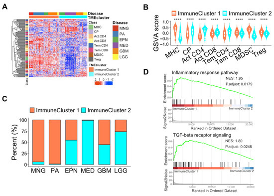 Unsupervised clustering using immune-related genes in brain tumors: (A) Heatmap representing the expression of immune-related genes in brain tumors. (B) GSVA score of classes of immune-related genes according to two distinct clusters. The statistical difference was calculated using the Kruskal–Wallis test. ****, p < 0.0001. MHC, major histocompatibility complex; CP, immune checkpoint; Act CD4, activated CD4; Act CD8, activated CD8; Tem CD4, T effector memory CD4; Tem CD8, T effector memory CD8; MDSC, myeloid-derived suppressor cell; Treg, regulatory T cell. (C) Bar plot showing the ratio of two distinct clusters by disease types. The y-axis shows the percentage of each cluster, and the x-axis shows disease types. MNG, meningioma; PA, pilocytic astrocytoma; EPN, ependymoma; MED, medulloblastoma; GBM, glioblastoma; LGG, lower-grade glioma. (D) GSEA plots indicating inflammatory response pathways (p.adjust = 0.0179, NES = 1.95) and TGF-beta receptor signaling (p.adjust = 0.0248, NES = 1.80) were enriched in immune cluster 1 compared to immune cluster 2. TGF, transforming growth factor.