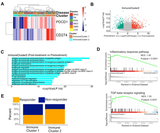 The detailed TME signature Is a biomarker for the prognoses of patients with brain tumor and for developing a more impactful therapeutic approach. To understand the TME landscape in brain tumors or other regions, previous studies carried out unsupervised clustering analysis with immune-related features for patient stratification and recapitulated the heterogenous characteristics [63,64,65]. In our study, unsupervised clustering based on immune-related genes showed that brain tumor patients could be separated into two distinct subpopulations with distinctive transcriptomic features. After we employed the same algorithm on patients with glioblastomas after anti-PD1 treatment using pembrolizumab, which is a humanized monoclonal immunoglobulin G4 (IgG4) anti-PD1 antibody, we found that the functions of DEGs between post-treatment and pre-treatment, the enrichment of pathways related to tumor progression, and clinical responses to anti-PD1 treatment were considerably different, suggesting that immune-related patient stratification could be a latent biomarker of reaction and clinical response to the PD-1 blockade in glioblastomas. This result might be affected by inflammatory responses and TGF-beta signaling in immune cluster 1 caused by MDSCs and Tregs and higher GSVA scores of activated T cells with elevated antigen processing and presentation with T-cell activation under treatment in immune cluster 2. Furthermore, previous studies have shown that pilocytic astrocytomas exhibit a significantly lower percentage of CD8+ T cells and NK T cells than glioblastomas, and PD-1+/CD4+ T cells are more enriched in medulloblastomas than in pilocytic astrocytomas [30,66]. Given that pilocytic astrocytomas were enriched in immune cluster 1 and medulloblastomas were enriched in immune cluster 2, the cellular composition of the TME strongly affects immunotherapy response. In particular, medulloblastomas, distinguished by high T-cell infiltration and immune cluster 2 enrichment, could be anticipated to exhibit a more favorable response to immunotherapy than other types of brain tumors.