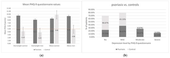 In general, the mean PHQ-9 value was significantly higher in psoriatic patients than in the control group (8.93 ± 5.91 points vs. 5.17 ± 3.71 points, p = 0.006). In the control group, mean PHQ-9 exceeded a threshold of mild depression (PHQ-9 ≥5 points) only among obese women, whereas among psoriatic patients, it surpassed the threshold irrespective of sex and adipose tissue overabundance level (Figure 5). Furthermore, 76.67% of psoriatic patients had PHQ-9 indicating mood disorders, with mild depression (36.67%) being the most frequent. Also, moderate and severe depression prevalence was considerably higher among psoriatic patients than in the control group (26.67% vs. 6.67% and 13.33% vs. 3.33%, p = 0.048 respectively). Among psoriatic patients, men were predisposed to suffer from more severe symptoms than women (15.38% vs. 0.0%, p = 0.63), and obese psoriatic patients more than overweight ones (16.67% vs. 11.11%, p = 0.78), but the observed differences were not statistically significant.