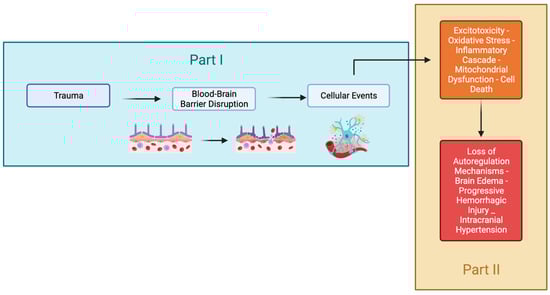 The summarized pathophysiology of TBI. This review will be separated into two parts. Part I will focus on the cellular and Brain blood barrier (BBB) that evolve following the injury. Part II will focus on the consequence of these molecular mechanisms and its repair.